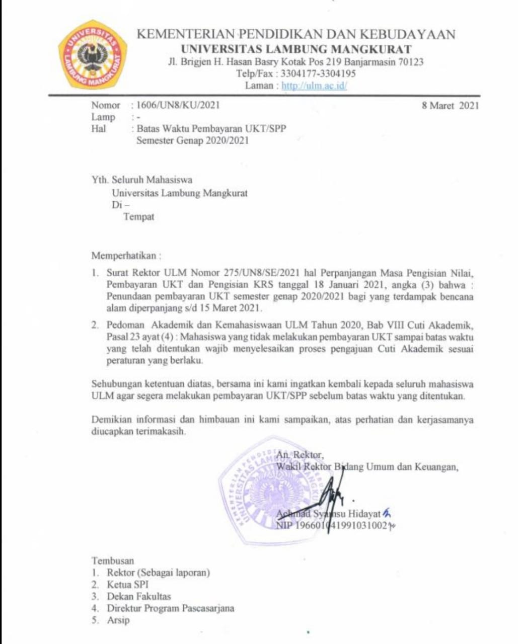 Batas waktu Pemabayran UKT/SPP Semester Genap 2020/2021