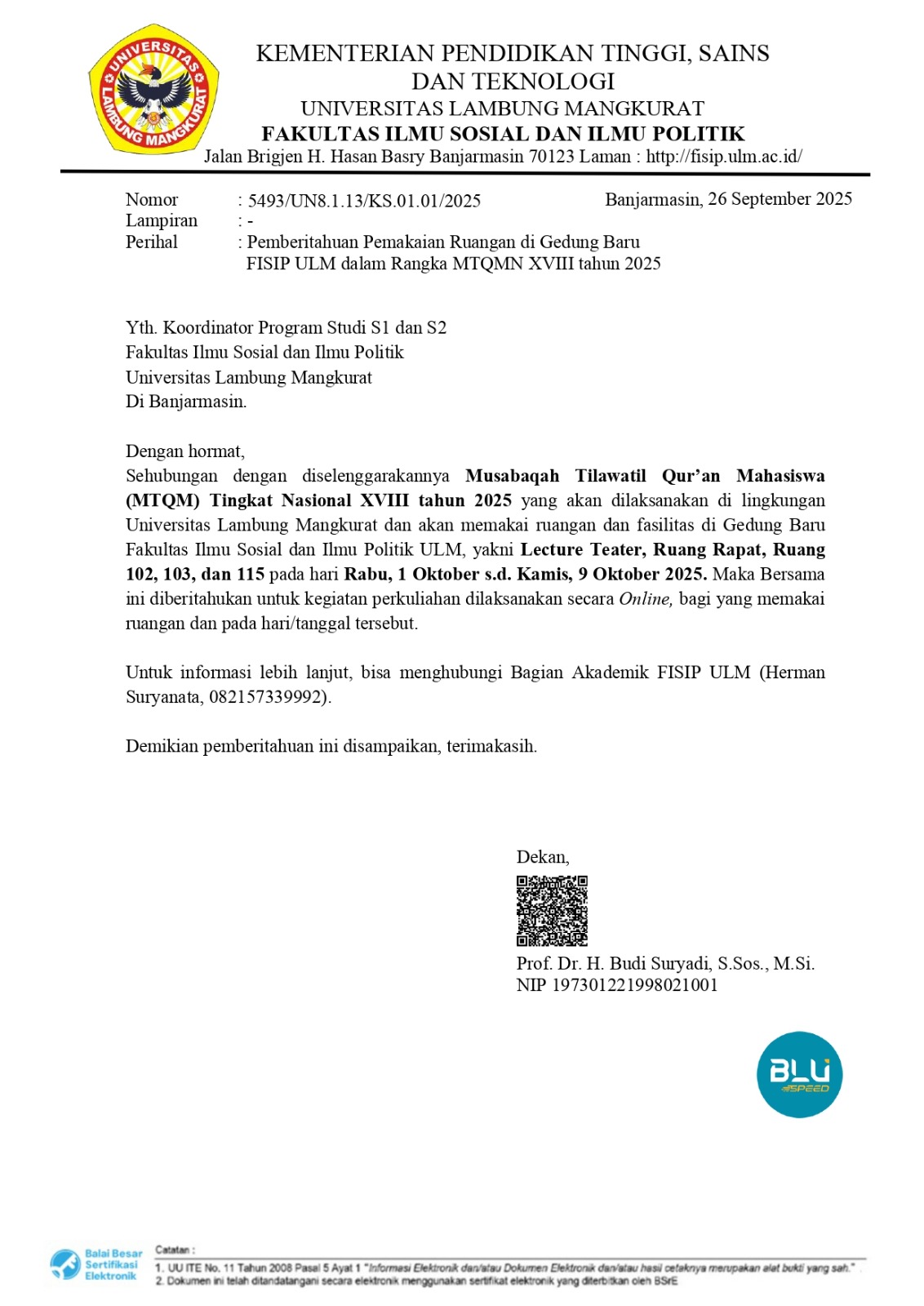 Pemberitahuan Pemakaian Ruang Kelas untuk MTQMN XVIII
