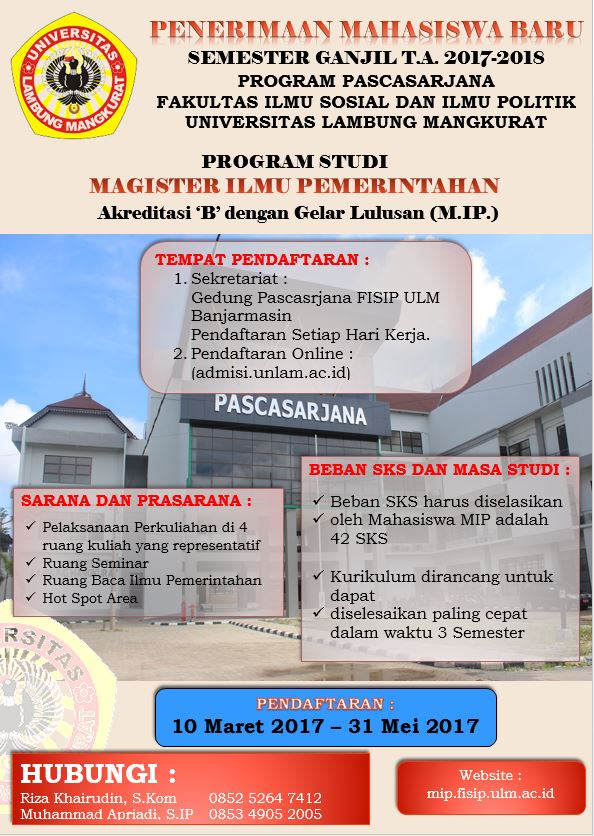 Program Magister Ilmu Pemerintahan menerima mahasiswa baru Tahun Akademik 2017-2018. mahasiswa baru yang diterapkan pada Program Studi Magister Ilmu Pemerintahan (MIP) ini merupakan kebijakan bersama antara seluruh program magister dan doktoral dengan Program Pascasarjana Universitas Lambung Mangkurat yaitu melalui pola rekruitmen satu atap dalam penerimaan mahasiswa baru.