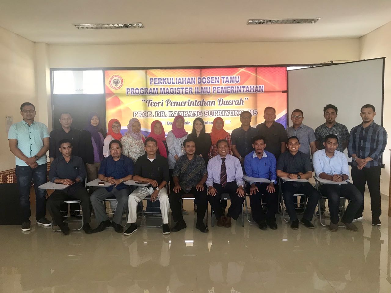 Dalam rangka Visiting Professor Program Studi Magister Ilmu Pemerintahan menyelenggarakan kuliah dosen tamu. Pada kesempatan ini profesor yang hadir adalah Prof. Dr. Bambang Supriyono, MS dari Universitas Brawijaya Malang. Prof. Dr. Bambang Supriyono, MS yang juga merupakan Dekan pada Fakultas Ilmu Administrasi Universitas Brawijaya Malang memberikan kuliah tentang Teori Pemerintahan Daerah.